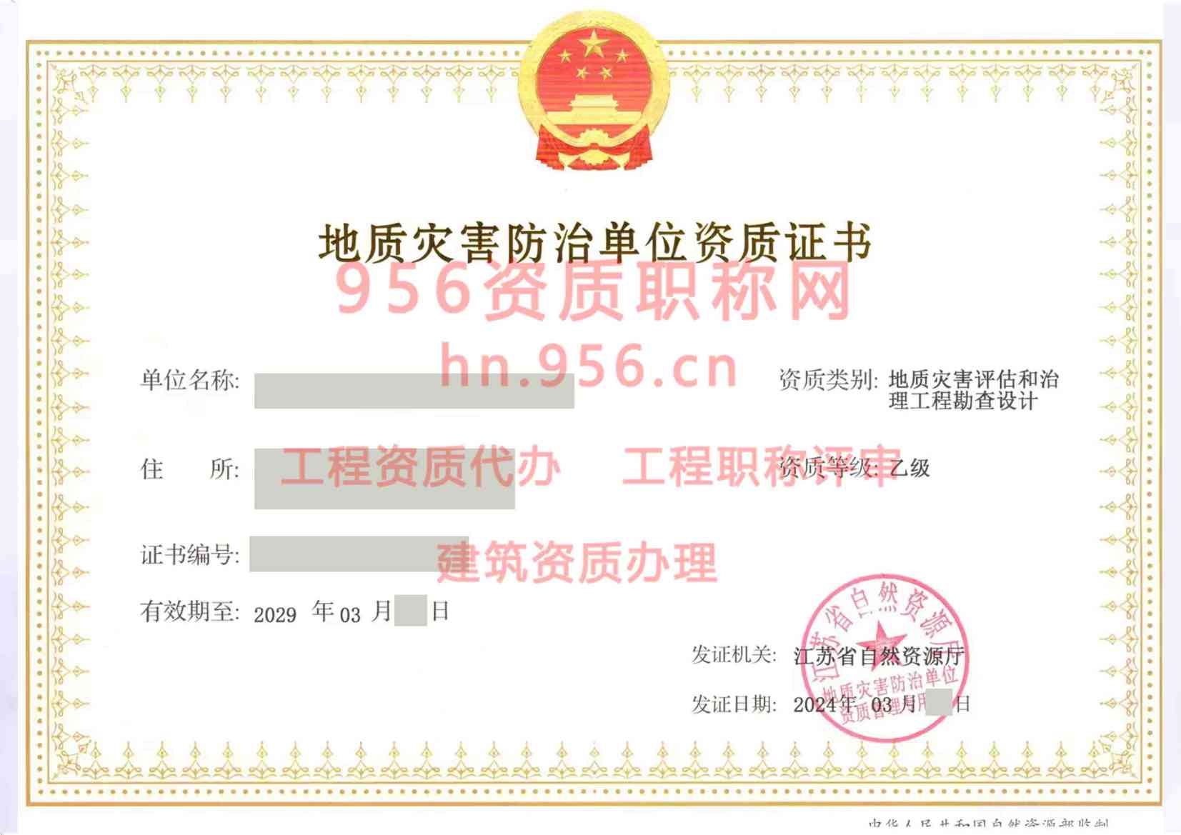2024年3月江苏省乙级地质灾害防治单位【工程勘查设计】资质证书展示01
